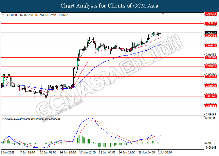 USDCHF, H4: USDCHF was traded flat while currently testing near the support level 0.9245. However, MACD which illustrate diminishing bullish momentum signal suggest the pair to be traded lower after it breaks below the support level.