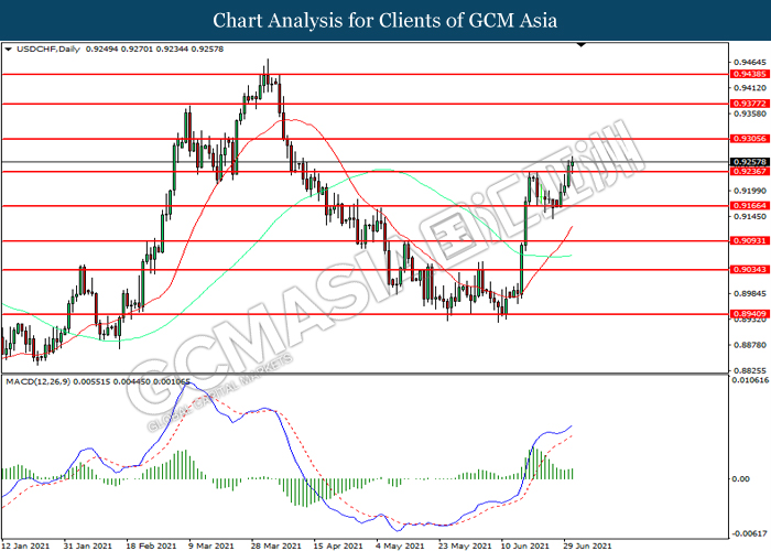 USDCHF, Daily: USDCHF was traded higher following prior breakout above the previous resistance level at 0.9235. MACD which illustrated increasing bullish momentum suggest the pair to extend its gains toward resistance level at 0.9305.