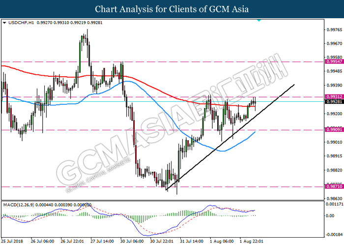 USDCHF, H1: USDCHF was traded higher while currently retest the resistance level 0.9930. MACD which show bullish signal with formation of golden cross suggest the pair may extend its gain after it breaks the resistance level 0.9930.