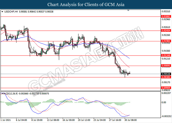 USDCHF, H4: USDCHF was traded flat while currently testing near the support level 0.9040. However, MACD which illustrate diminishing bearish momentum signal with the formation of golden cross suggest the pair to be traded higher in short term towards the resistance level 0.9090.