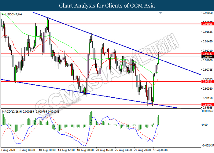 USDCHF, H4: USDCHF was traded higher while currently testing the resistance level at 0.9115. MACD which illustrated increasing bullish momentum suggest the pair to extend its gains after it successfully breakout above the resistance level.
