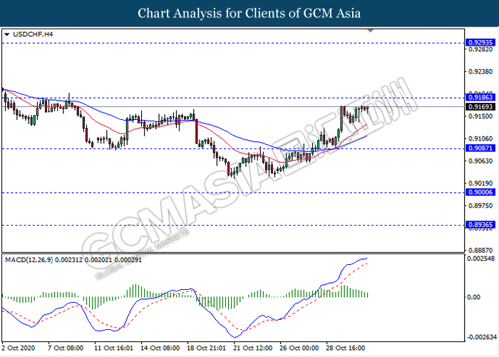 USDCHF, H4: USDCHF was traded higher while currently testing near the resistance level 0.9185. However, MACD which illustrate diminishing bullish momentum signal suggest the pair to experience a technical correction towards the support level 0.9085.