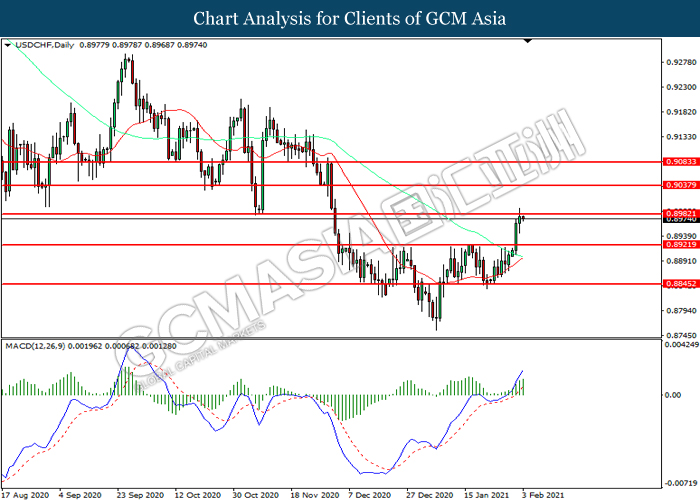 USDCHF, Daily: USDCHF was traded higher while currently testing the resistance level at 0.8980. MACD which illustrated increasing bullish momentum suggest the pair to extend its gains after it successfully breakout above the resistance level.