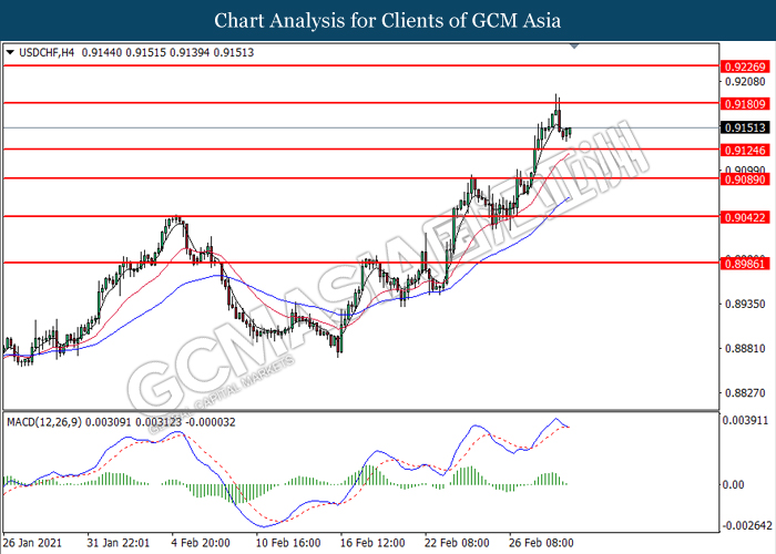 USDCHF, H4: USDCHF was traded lower following prior retracement from the resistance level at 0.9180. MACD which illustrated diminishing bullish momentum suggest the pair to extend its losses toward the support level at 0.9125.