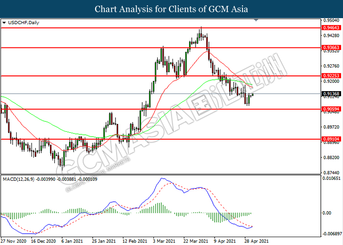 USDCHF, Daily: USDCHF was traded lower while currently near the support level at 0.9060. However, MACD which illustrated diminishing bearish momentum suggest the pair to extend its gains toward resistance level at 0.9225.