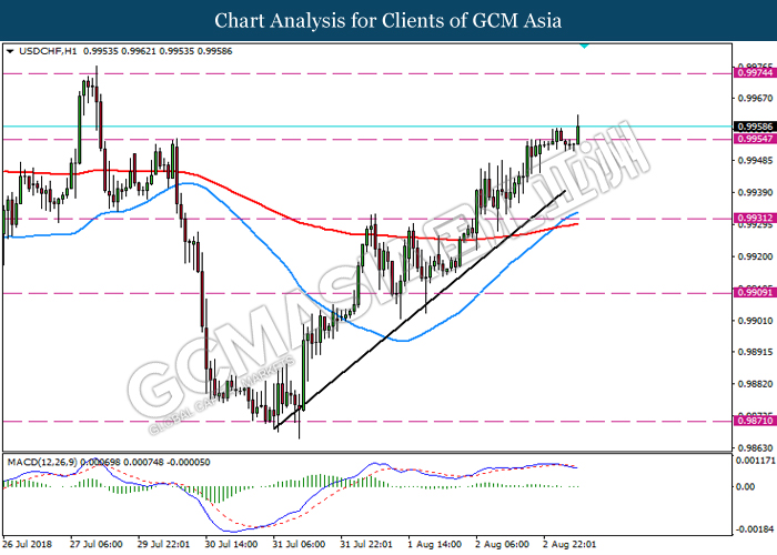 USDCHF, H1: USDCHF was traded higher while currently testing the resistance level 0.9955. Although MACD which display starting bearish signal with death cross formation, a red candle retrace back below the resistance level 0.9955 is required for further confirmation.