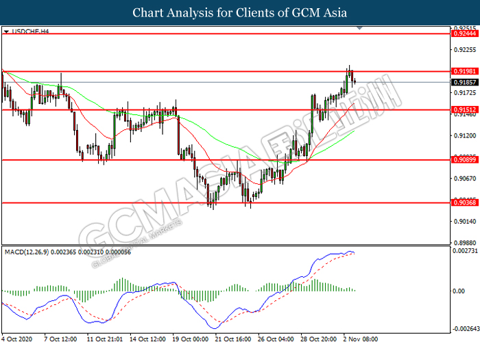 USDCHF, H4: USDCHF was traded lower following prior retracement from the resistance level at 0.9200. MACD which illustrated diminishing bullish momentum suggest the pair to extend its losses toward support level at 0.9150.