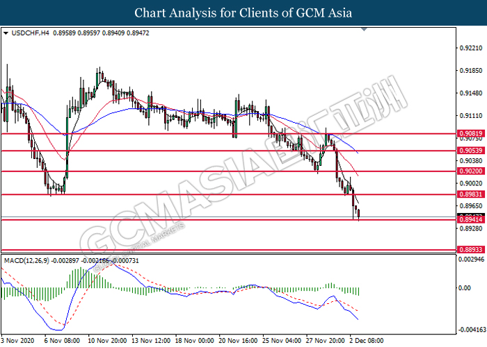 USDCHF, H4: USDCHF was traded lower while currently testing the support level at 0.8940. MACD which display bearish bias momentum signal suggest the pair to extend its losses after it successfully breakout below the support level at 0.8940.