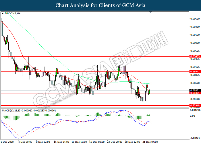 USDCHF, H4: USDCHF was traded lower while currently testing the support level at 0.8830. However, MACD which illustrated increasing bullish momentum suggest the pair to be traded higher in short-term as technical correction.