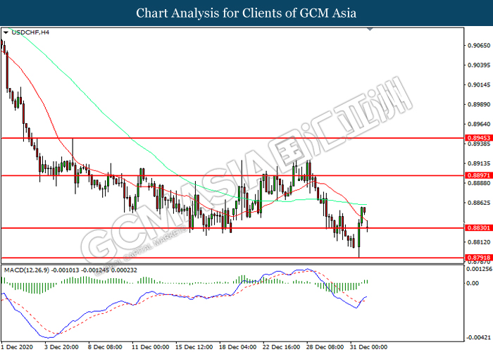 USDCHF, H4: USDCHF was traded lower while currently testing the support level at 0.8830. However, MACD which illustrated increasing bullish momentum suggest the pair to be traded higher in short-term as technical correction.