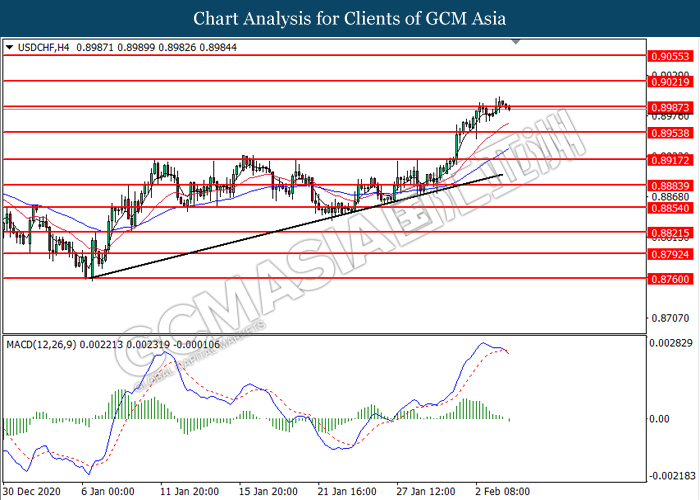 USDCHF, H4: USDCHF was traded lower following prior retracement near the resistance level at 0.8985. MACD which illustrated bearish momentum suggest the pair to extend its losses toward the support level at 0.8955.
