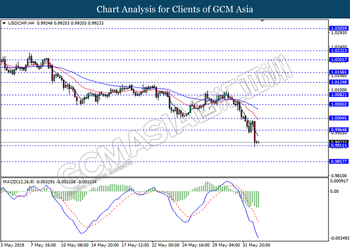 USDCHF, H4: USDCHF was traded lower while currently testing near the support level 0.9910. However, MACD which illustrate diminishing bearish bias signal suggest the pair to experience a technical correction towards the resistance level 0.9965.