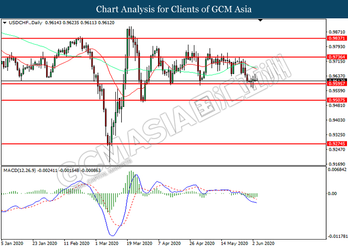 USDCHF, Daily: USDCHF was traded lower while currently testing the support level at 0.9595. However, MACD which illustrated diminishing bearish momentum suggest the pair to be traded higher in short-term as technical correction.