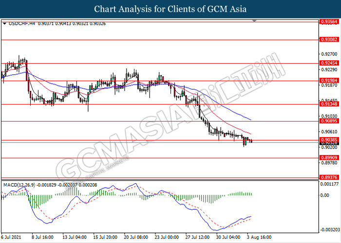 USDCHF, H4: USDCHF was traded lower while currently testing the support level 0.9040. MACD which illustrate diminishing bullish momentum signal suggest the pair to extend its losses after it breaks below the support level.