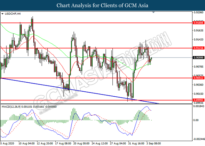 USDCHF, H4: USDCHF was traded lower following prior retracement from the resistance level at 0.9120. MACD which illustrated increasing bearish momentum suggest the pair to extend its losses toward support level at 0.9050.