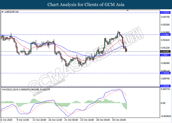 USDCHF, H4: USDCHF was traded lower while currently testing near the support level 0.9085. MACD which illustrate bearish bias signal suggest the pair to extend its losses after it breaks below the support level.