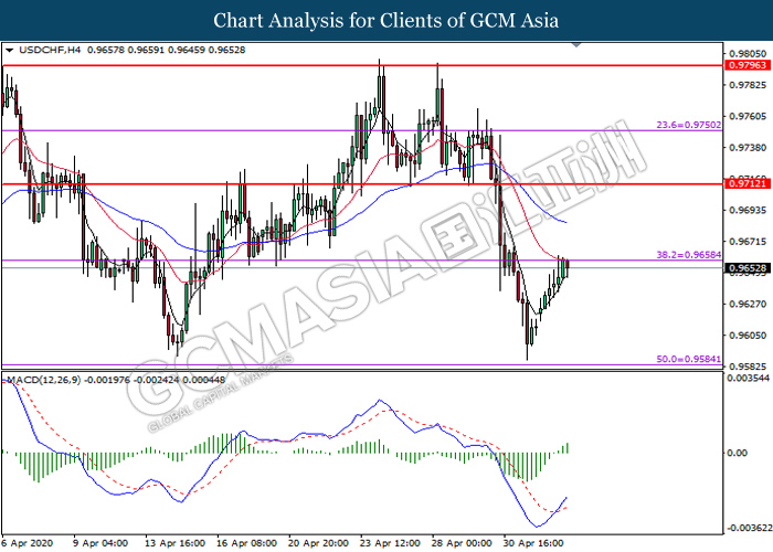 USDCHF, H4: USDCHF was traded higher while currently testing the resistance level at 0.9660. MACD which illustrate bullish bias momentum suggest the pair to extend its gains after it successfully breakout above the resistance level at 0.9660.