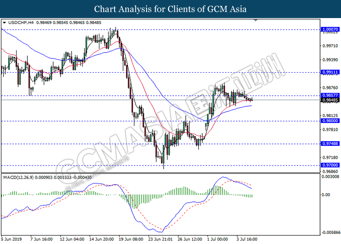 USDCHF, H4: USDCHF was traded lower following prior breakout below the previous support level 0.9855. MACD which illustrate bearish momentum signal suggest the pair to extend its losses towards the support level 0.9800.