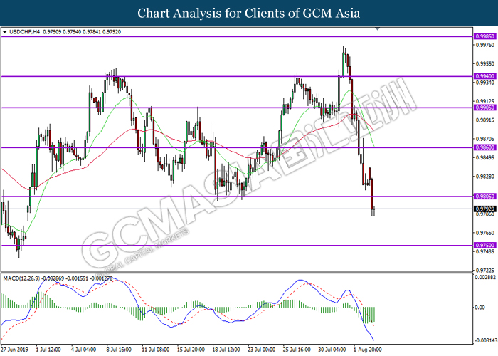 USDCHF, H4: USDCHF was traded lower following prior breakout below previous support level 0.9805. MACD which illustrate ongoing bearish momentum suggest the pair to extend its losses towards the support level 0.9750.