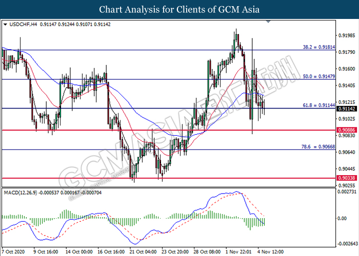 USDCHF, H4: USDCHF was traded lower while currently testing near the support level 0.9115. MACD which illustrate bearish bias signal suggest the pair to extend its losses after it breaks below the support level.