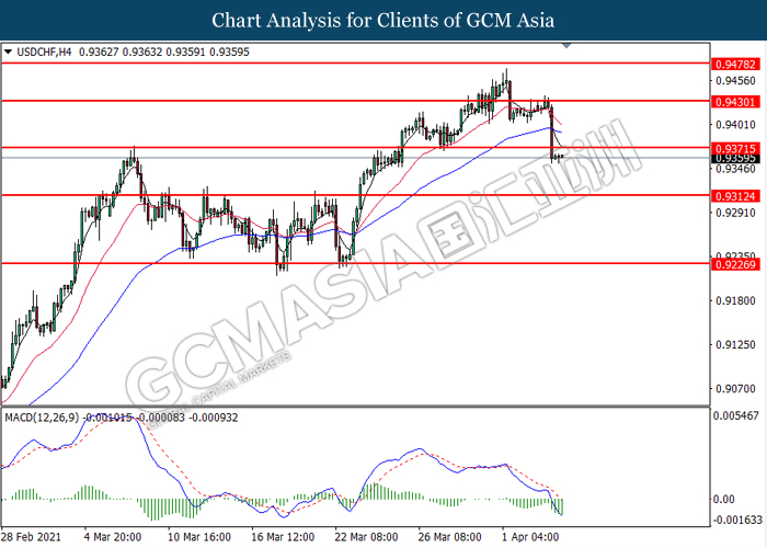 USDCHF, H4: USDCHF was traded lower following prior breakout below the previous support level at 0.9370. MACD which illustrated bearish bias signal suggests the pair to extend its losses toward the support level at 0.9310.