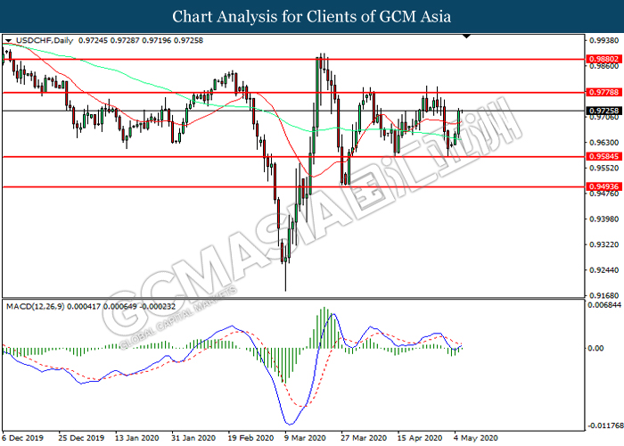 USDCHF, Daily: USDCHF was traded higher following prior rebound from the support level at 0.9780. MACD which illustrated diminishing bearish momentum suggest the pair to extend its gains toward resistance level at 0.9780