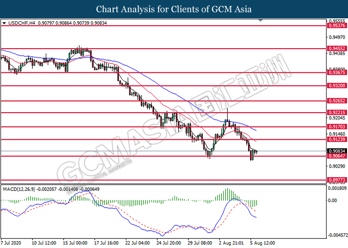 USDCHF, H4: USDCHF was traded higher following prior rebound from the support level at 0.9065. MACD which illustrate diminishing bearish momentum signal suggest the pair to extend its gains toward the resistance level at 0.9125.