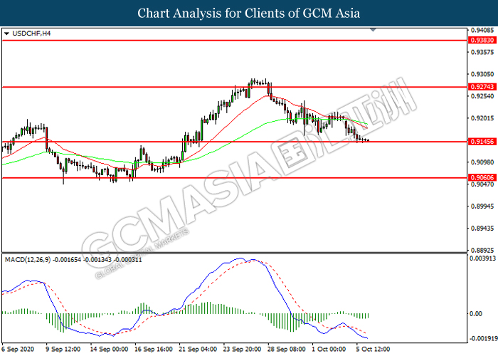 USDCHF, H4: USDCHF was traded lower while currently testing the support level at 0.9145. However, MACD which illustrated diminishing bearish momentum suggest the pair to be traded higher in short-term as technical correction.