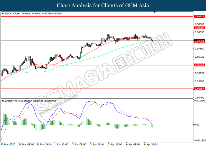 USDCHF, H1: USDCHF was traded lower while currently testing the support level at 0.9750. MACD which illustrated increasing bearish momentum suggest the pair to extend its losses after it successfully breakout the support level.