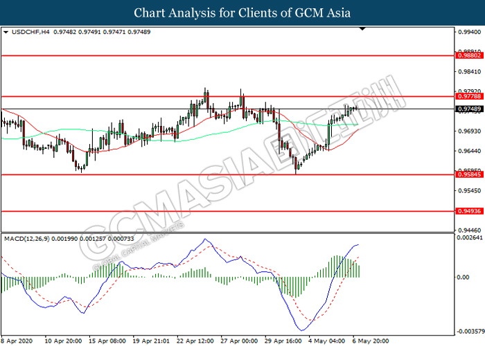 USDCHF, H4: USDCHF was traded higher while currently near the resistance level at 0.9780. However, MACD which illustrated diminishing bullish momentum suggest the pair to be traded lower in short-term as technical correction.