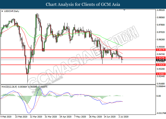 USDCHF, Daily: USDCHF was traded lower following prior breakout below the previous support level at 0.9435. MACD which illustrated increasing bearish momentum suggest the pair to extend its losses toward support level at 0.9365.
