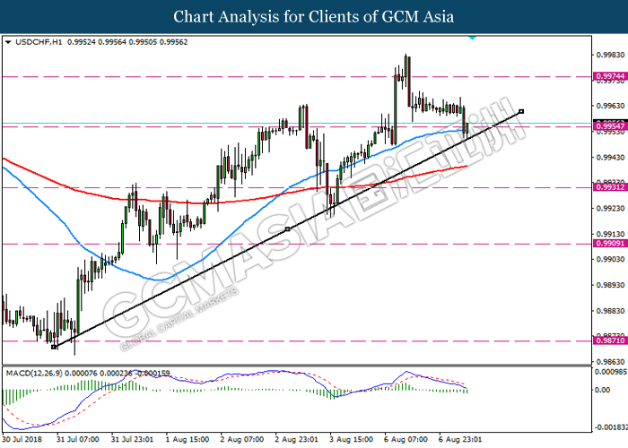 USDCHF, H1: USDCHF was traded higher lower while currently testing the trend line and support level 0.9955. Although MACD which illustrate bearish signal with death cross formation, a breakout below the support level 0.9955 and trend line is required to attain further confirmation.