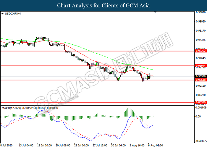 USDCHF, H4: USDCHF was traded lower while currently testing the support level at 0.9060. However, MACD which illustrated increasing bullish momentum suggest the pair to be traded higher in short-term as technical correction.