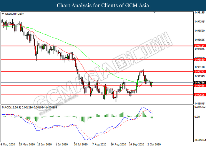 USDCHF, Daily: USDCHF was traded lower while currently testing the support level at 0.9145. MACD which illustrated increasing bearish momentum suggest the pair to extend its losses after it successfully breakout below the support level.
