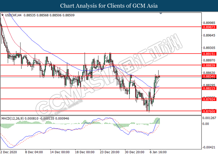 USDCHF, H4: USDCHF was traded higher while currently testing the resistance level at 0.8855. MACD which illustrated bullish bias momentum suggest the pair to extend its gains after it successfully breakout above the resistance level at 0.8855.
