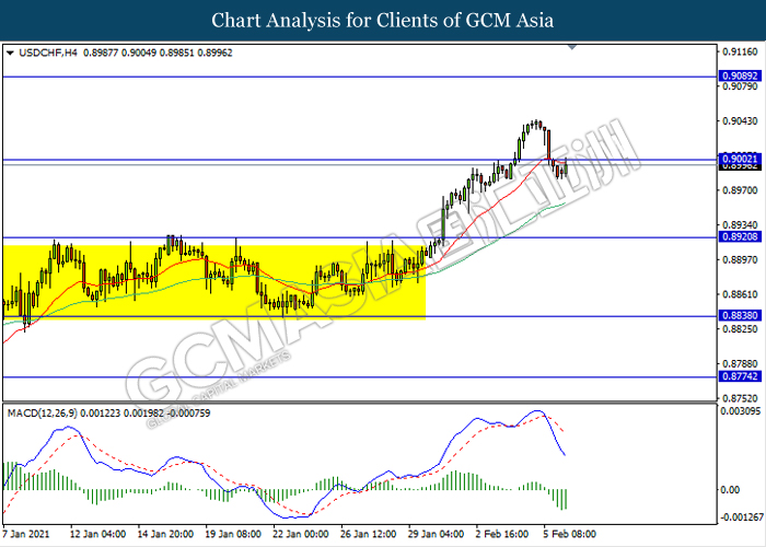 USDCHF, H4: USDCHF was traded lower following recent breakout below the previous support level 0.9000. MACD which illustrate ongoing bearish momentum signal suggest the pair to extend its losses towards the support level 0.8920.