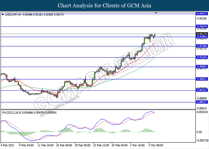 USDCHF, H4: USDCHF was traded flat while currently testing the support level 0.9295. However, MACD which illustrate diminishing bullish momentum signal suggest the pair to be traded lower after it breaks below the support level.