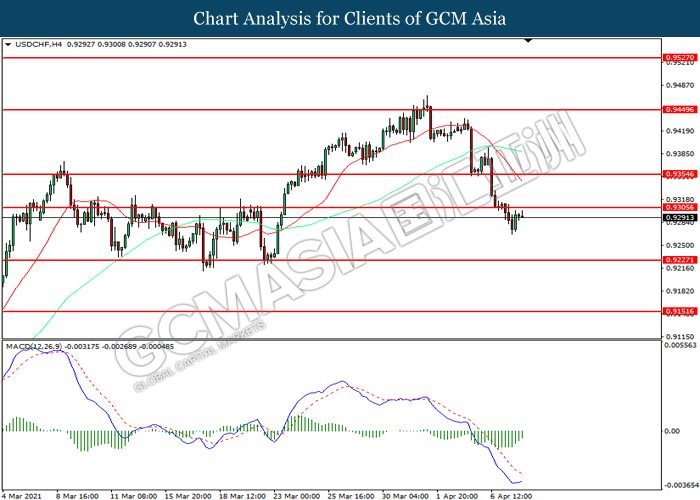 USDCHF, H4: USDCHF was traded higher while currently testing the resistance level at 0.9305. MACD which illustrated diminishing bearish momentum suggest the pair to extend its gains after it successfully breakout above the resistance level.