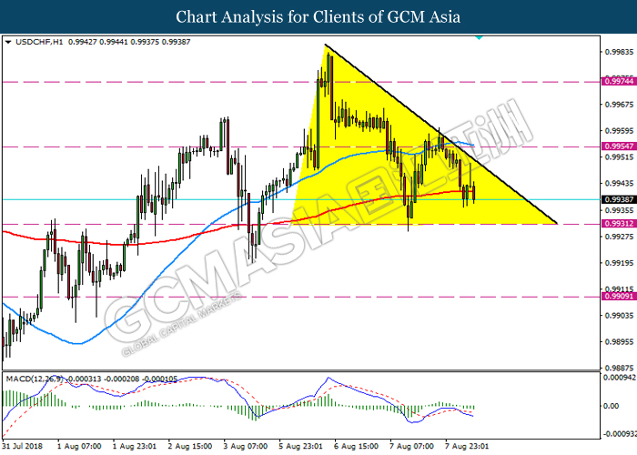 USDCHF, H1: USDCHF remain traded in a descending symmetrical triangle following recent retracement from resistance level 0.9955 and top level of the triangle. MACD which display bearish signal and recent price action suggest the pair may extend its losses towards the bottom level of the triangle which is also resistance level 0.9930.