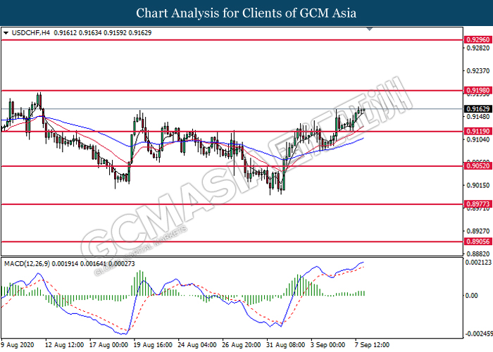 USDCHF, H4: USDCHF was traded higher following prior rebound from the support level at 0.9120. MACD which illustrates bullish bias momentum suggest the pair to extend its gains toward the resistance level at 0.9200.
