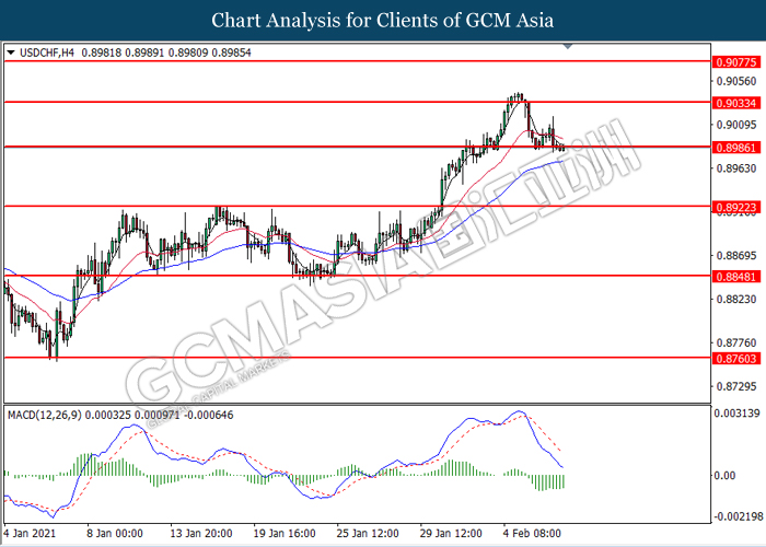 USDCHF, H4: USDCHF was traded lower while currently testing the support level at 0.8985. MACD which illustrated bearish bias momentum suggest the pair to extend its losses after it successfully breakout below the support level.