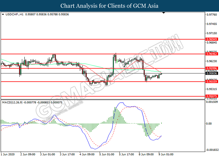 USDCHF, H1: USDCHF was traded higher following prior rebound from the support level at 0.9555. MACD which illustrated increasing bullish momentum suggest the pair to extend its gains toward resistance level at 0.9600.