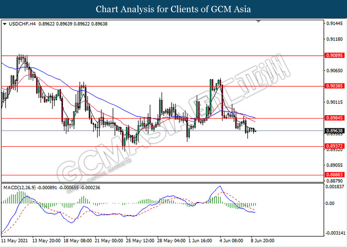 USDCHF, H4: USDCHF was traded lower following recent retracement from its high level. MACD which illustrate bearish momentum signal suggest the pair to extend its losses towards the support level 0.8935.