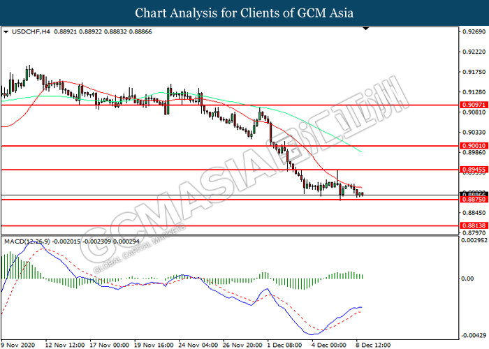USDCHF, H4: USDCHF was traded lower while currently near the support level at 0.8875. MACD which illustrated diminishing bullish momentum suggest the pair to extend its losses after it successfully breakout below the support level.