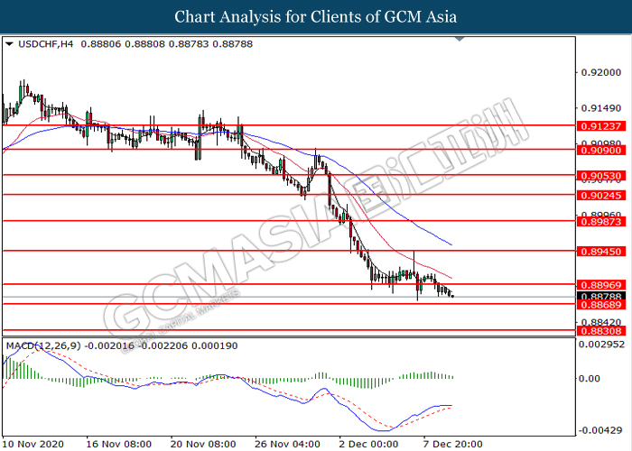 USDCHF, H4: USDCHF was traded lower following prior breakout below the previous support level at 0.8895. MACD which display diminishing bullish momentum signal suggest the pair to extend its losses toward the support level at 0.8870.