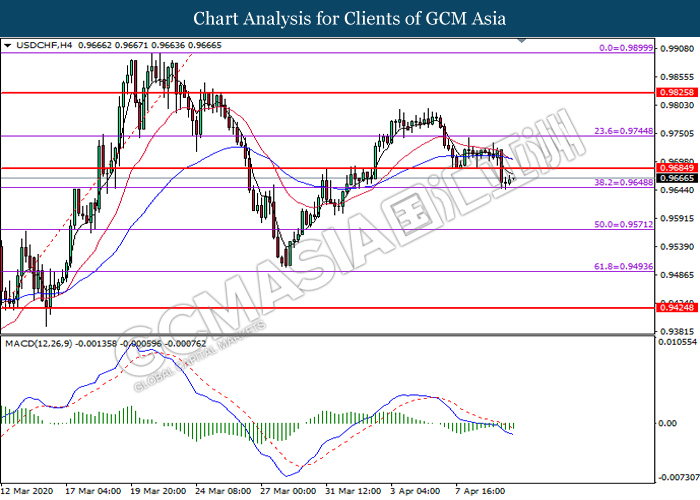 USDCHF, H4: USDCHF was traded higher following prior rebound from the support level at 0.9650. MACD which illustrate diminishing bearish momentum suggest the pair to extend its gains toward the resistance level at 0.9685.