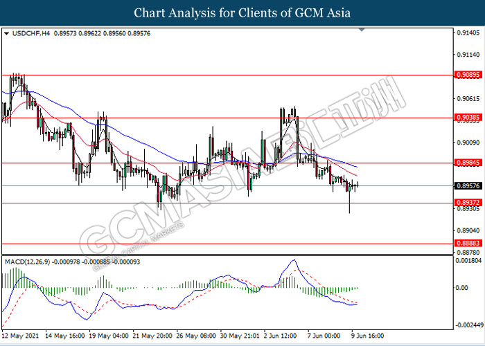 USDCHF, H4: USDCHF was traded lower while currently testing near the support level 0.8935. However, MACD which illustrate diminishing bearish momentum signal suggest the pair to be traded higher as a technical correction towards the resistance level 0.8985.