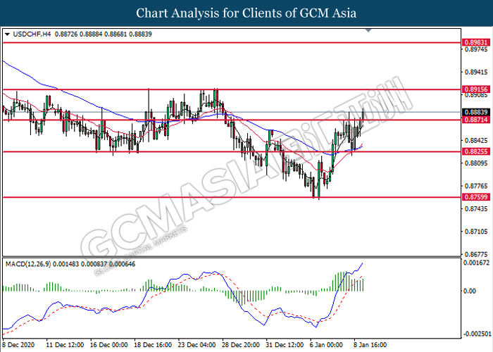 USDCHF, H4: USDCHF was traded higher while currently testing the resistance level at 0.8870. MACD which illustrated bullish bias momentum suggest the pair to extend its gains after it successfully breakout above the resistance level at 0.8870.