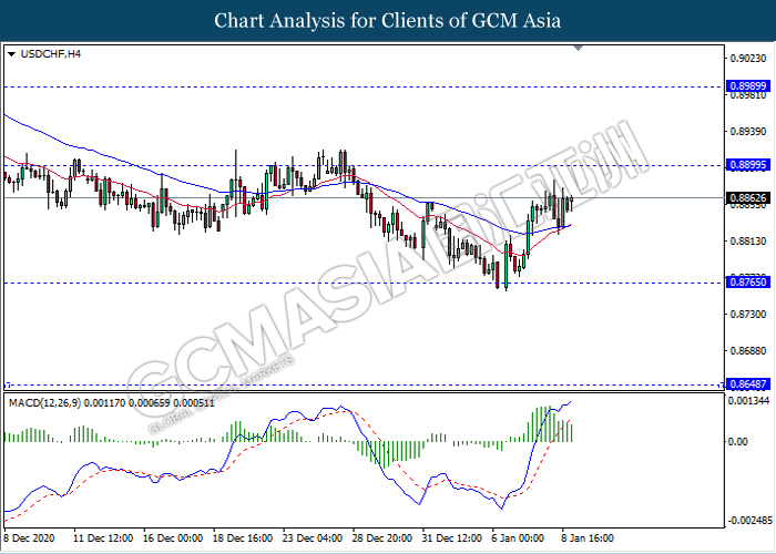 USDCHF, H4: USDCHF was traded higher following prior rebound from its low level. MACD which illustrate bullish bias signal suggest the pair extend its rebound towards the resistance level 0.8990.