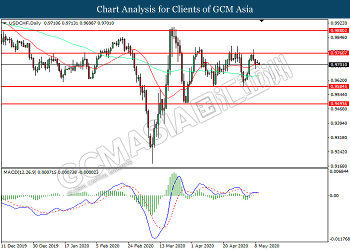 USDCHF, Daily: USDCHF was traded lower following prior retracement from the resistance level at 0.9760. However, MACD which illustrated diminishing bearish momentum suggest the pair to be traded higher in short-term as technical correction.